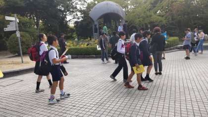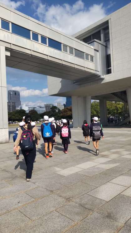 資料館に向かっています。中はたくさんの人でしたが、岩田さんに平和記念公園の下には瓦礫や、なくなられた方が眠っておられるかもというお話を聞き、いろいろなことに想いを馳せて歩きました。