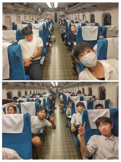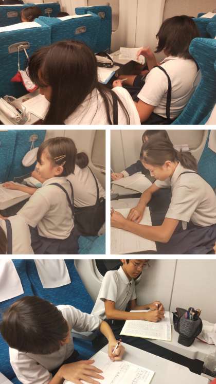 新幹線の中でこづかい帳をつけたり、日記を書いたりと思い出をふり返っています。少し疲れてねむくなっているこもいます。