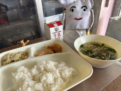 今日の給食は、鶏肉のチリソース焼き、焼き豚とワンタンの皮のスープ、切干しだいこんのごま辛みづけです。