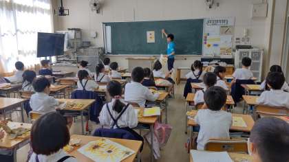 ひまわりを大きくぼかしなどの技法も使って描いています。どんな作品になるか楽しみですね。