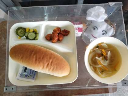 今日の給食は、まぐろのオーロラ煮、スープ、きゅうりとコーンのサラダです。