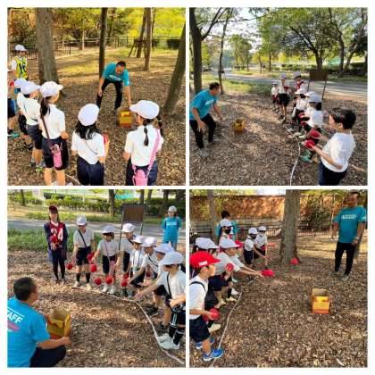 京橋口では、班のみんなで一斉にボールをプーさんの壺にいれるゲームです。みんなで何個入るかな?