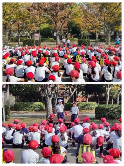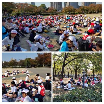 時計台に全チームが戻ってお楽しみのお弁当です。もぐもく式が終わって、各班に分かれてお弁当食べました。