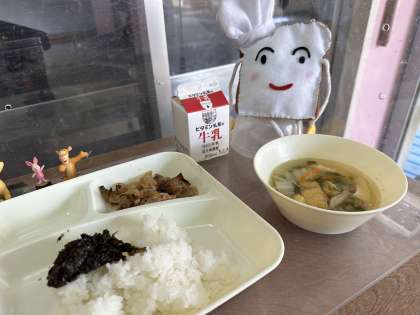 今日の給食は、豚肉のスタミナ焼き、すまし汁、のりのつくだ煮です。