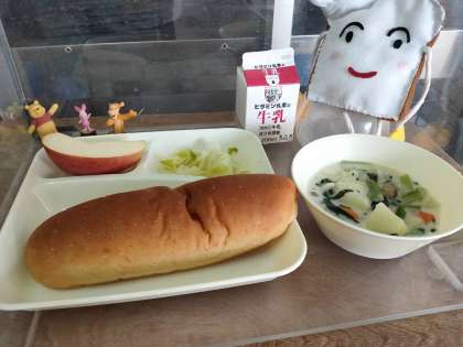 今日の給食は、きのこのクリームシチュー、キャベツのピクルス、りんごです。