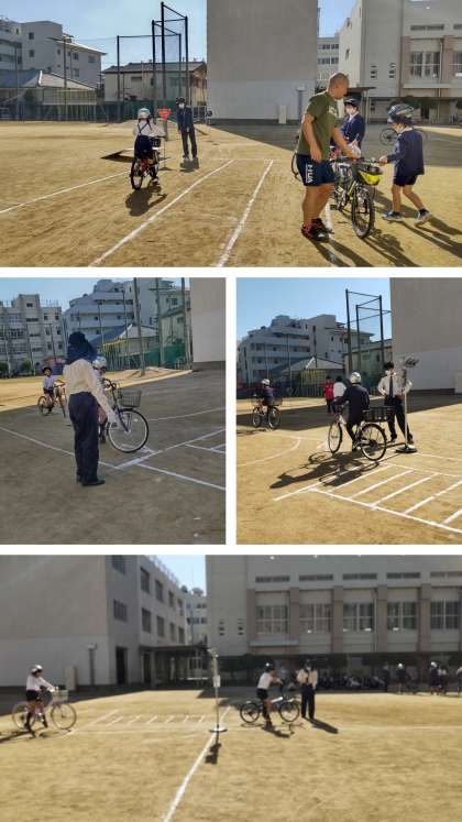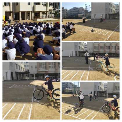 交通課の方に来ていただいて模擬の道路を運動場にかき、信号機を置いて自転車の乗り方を学習しました。