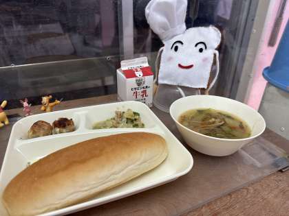 今日の給食は、焼きシューマイ、中華みそスープ、ツナと野菜のオイスターソースいためです。