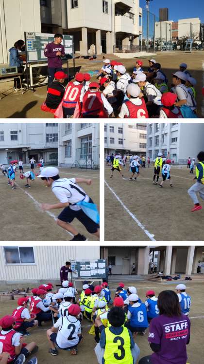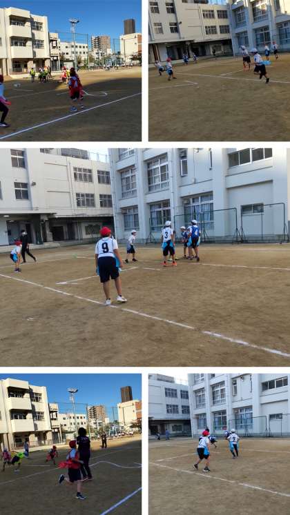 先週、今週とフラッグフットボールをしました。先週はゲームの仕方を体育の授業でしている6年生が教えてくれてとにかく新しいゲームを知ることを頑張りました。今日は、グループごとにめあてを決め、作戦を立てて2試合しました。勝ったり負けたりよりも4・5・6年生がしっかり声をかけあい教え合えているかをめあてに頑張りました。6年生が出したパスを4年生がキャッチしたり、5年生が相手のパスをカットしたりとみんなそれぞれの役割を果たしている場面がたくさん見られました。どのチームも話し合ってしっかり動いた2試合でした。