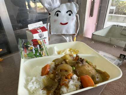 今日の給食は、ハンバーグカレーライス、カリフラワーのピクルス、豆こんぶです。