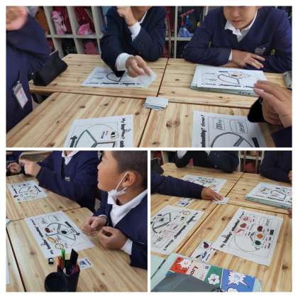 金曜日の英語の時間は、 昨日の夕食は何を食べたか?という会話を楽しんだ後、1000キロカロリーに近くなった人が勝ちのゲームで、緑、黄色、赤色の食べ物が揃わないといけないので、パン・ご飯・もちと黄色ばかりカードをひいた子はカロリーばかり増えていました。最後に班対抗早押しでその食べ物が何色グループか英語で答えるゲームで競いました。