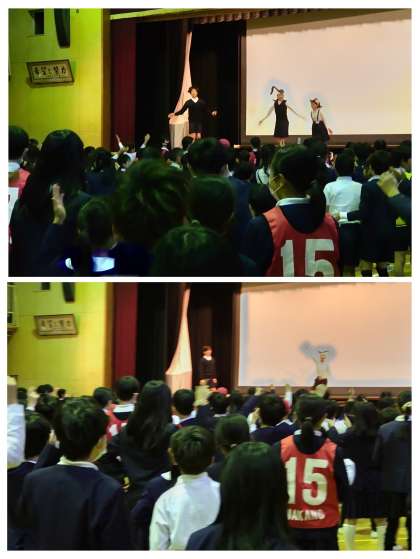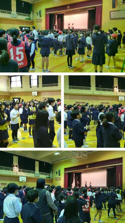 今日の集会は、音符ちゃんとダンスを踊ろう!ということで、「アンパンマンマーチ」「タンスホール」「ピーマン体操」の3曲をみんなで踊りました。集会委員会の音符ちゃんの振りを一生懸命見て踊り盛り上がりました。