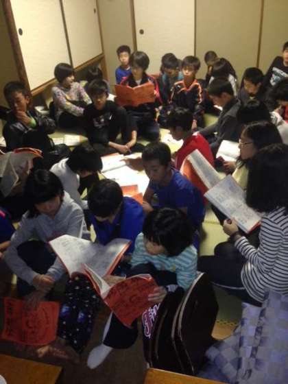 先生の部屋でリーダー会議です。スペイン村での活動の反省をしました。普段そんなに話すことがなかった人と、活動班でたくさん話をすることができて良かったと述べている人もいました。よかったね。では、明日の活動に備えて、おやすみなさい・・・。