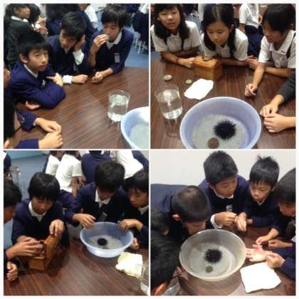 ウニの殻を見る! ウニを海水に浸すと、管足がニョキニョキ。その先には吸盤が。