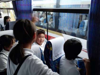 6年生は上野ドライブインを出ました。寝ている人もいますし、歌を歌ったり、DVDを見たりしています。