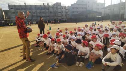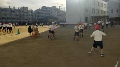 箱あてゲーム、昨日初めてしました。どうやったらディフェンスの人を抜いて段ボールにあてれるか考えてパスを回しました。