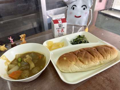 今日の給食は、ミートボールと野菜のカレー煮、ツナとこまつなのソテー、白桃(かんづめ)です。