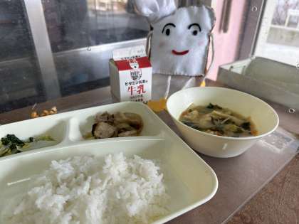 今日の給食は、豚肉のごまだれ焼き、みそ汁、きくなとはくさいのおひたしです。