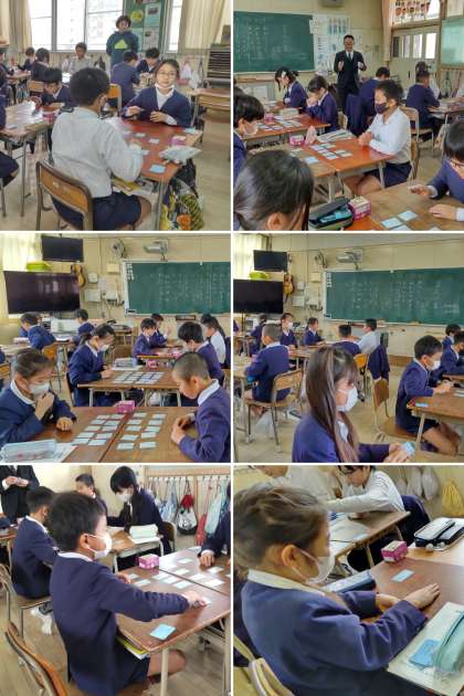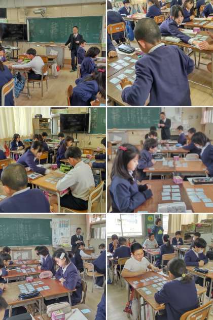 今日は磯路小学校からゲストティーチャーとして糸井校長先生に来ていただいて百人一首を教えていただきました。百人一首の歴史や対抗戦の仕方を教えてもらいました。