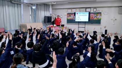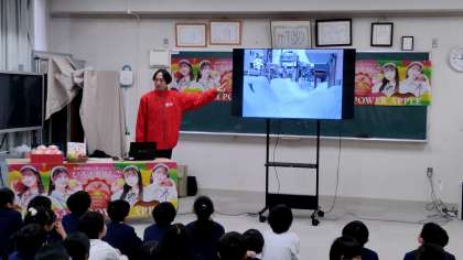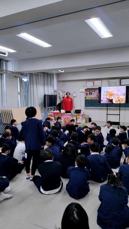 1月12日(金)青森県弘前市から名産である「弘前りんご」にかかわる授業をしていただきました。「リンゴ農家の1年」を紹介していただく中で、時々リンゴにまつわるクイズも入れていただき、最後には「質問コーナー」でみんなよく質問していました。お尻に針がない蜂がりんごづくりに大きな役割をしていることに、子どもたちも多く質問していました。、
