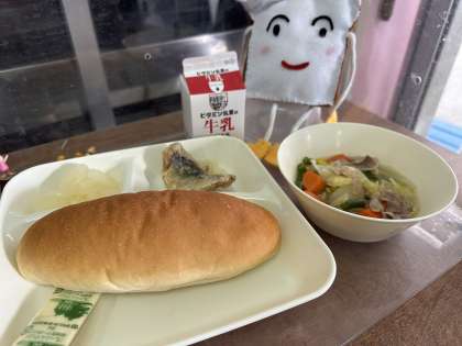 今日の給食は、あじのレモンマリネ、てぼ豆のスープ煮、和なし(かんづめ)です。
