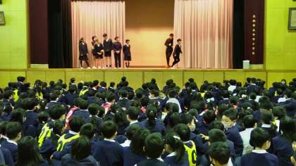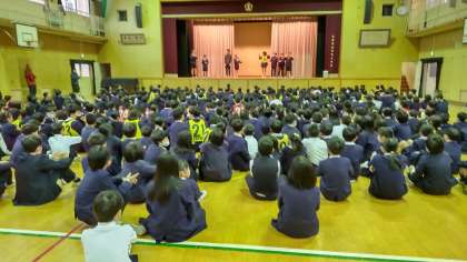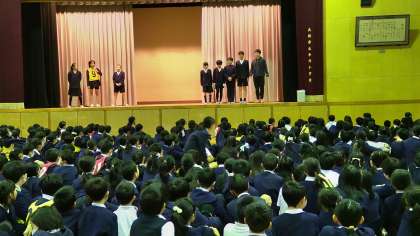 今日の集会は、「右、左どっち、How many peaple?」で右の幕と左の幕に隠れてる人数を当てるゲームでした。舞台を行ったり来たりしてる間に何人いるかわからなくなって3問目は間違っている人もたくさんいました。今日も楽しいゲームを考えてくれた集会委員でした。