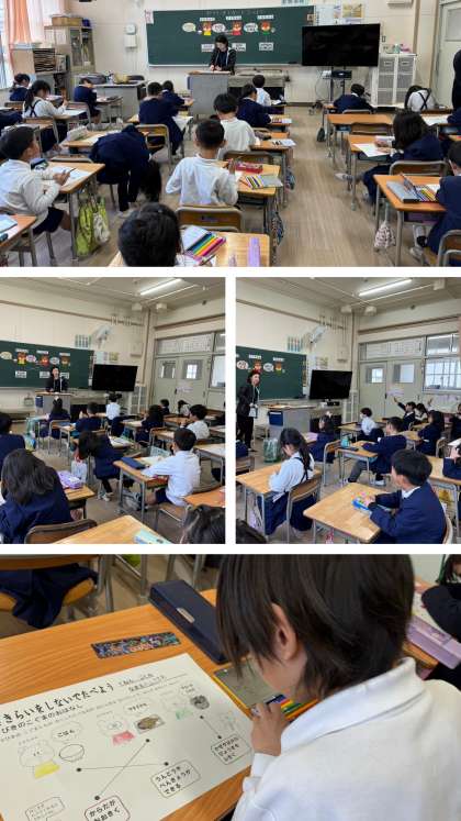 都島小学校の栄養教諭の先生から、「すききらいをしないでたべよう」がテーマの授業を受けました。苦手な食べ物が違う3匹のクマの物語を聞きました。子どもたちはクマの表情から、「このクマさんは魚が嫌いやと思う!」「私も煮物あんまり好きじゃない」「ごはんが嫌いな人もいるんだ!」と共感したり驚いたりしながら聞いていました。