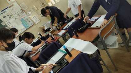 「春の海」のBGMが流れる中、「新しい風」を書き初め用半紙に書きました。始筆、終筆のふでのつかいかたや漢字とひらがなの文字のバランスを考えて書きました。