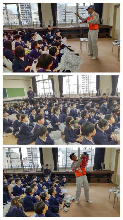5年生は身近なものを使っての応急手当の方法で、止血の方法や骨折のときの添え木の代わりに本を使う、スーパーの袋で腕を吊る、包帯の代わりにバンダナで頭を包むなど赤十字の方に来ていただいて教えていただきました。