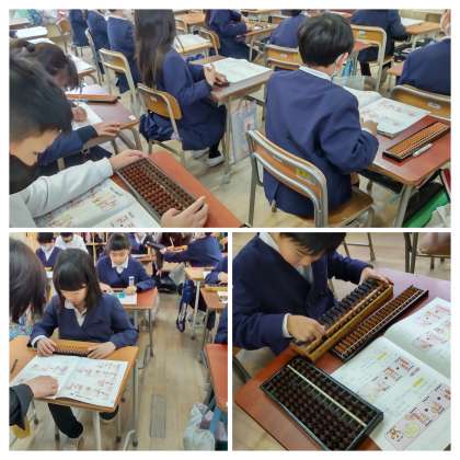 今日は、そろばんのゲストティーチャーに来ていただいて学習しました。いろいろなそろばんを持ってきていただいて、教えていただきました。みんな興味津々で、パチパチ音が教室中に響いていました。