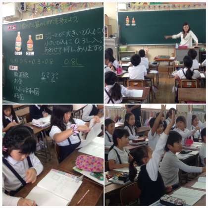 3年生の研究授業がありました。小数ですね。今日は、1クラスを「ぐんぐんコース」と「のびのびコース」に分けて、2人の先生、2つの教室で学習しました。