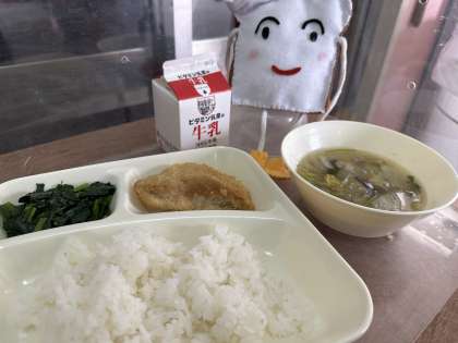 今日の給食は、たらフライ、うすくず汁、ほうれんそうのおひたしです。