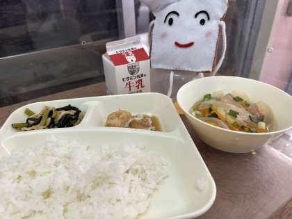今日の給食は、鶏肉となにわ甘辛ソースかけ、船場汁、こまつなの炊いたんです。