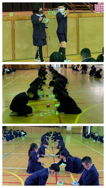今日の5・6時間目、講堂で百人一首大会をしました。学級ポストに「学年で百人一首大会をしたい」という意見が入っていたので、実行委員会をたてて、自分たちで計画して準備をしました。当日も盛り上がりました。来週は学習参観でも見ていただきます。