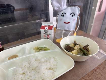 今日の給食は、肉じゃが、はくさいのゆず風味、白花豆の煮ものです。
