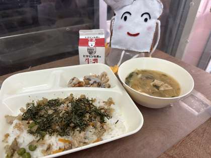 今日の給食は、鶏ごぼうご飯、みそ汁、焼きれんこんです。
