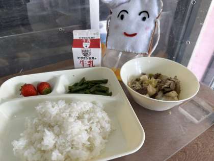 今日の給食は、すき焼き煮、さんどまえのごまあえ、いちごです。