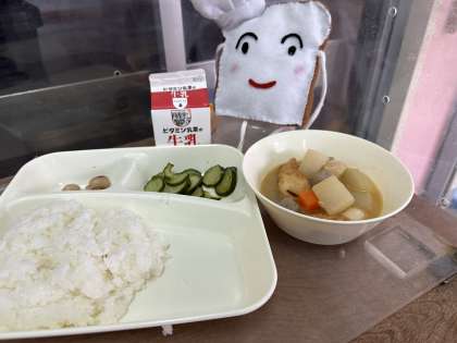 今日の給食は、関東煮、きゅうりの梅風味、とら豆の煮ものです。