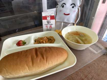 今日の給食は、とうふのミートグラタン、じゃがいもの野菜のスープ、いちごです。
