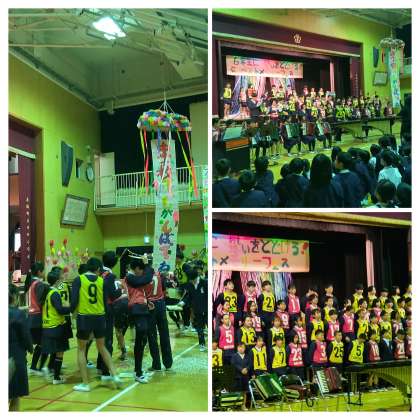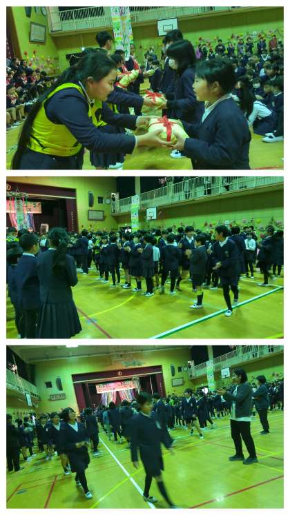 くす玉を割ってお祝いメッセージをもらって会も終わるかなと思ったときサプライズで6年生から演奏と歌のプレゼントがありました。そしてもう一つ手作りの雑巾も各クラスの代表がもらいました。代表の人は緊張したそうです。「6年生に想いを届けるベストメモリーフェス」6年生ありがとう。中学生になってもがんばってね。全校で楽しい時間を過ごすことができました。