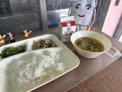 今日の給食は、豚肉のしょうが焼き、とうふのみそ汁、じゃこピーマンです。