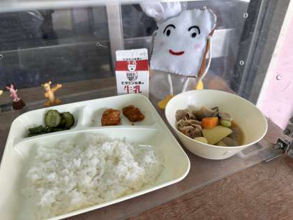 今日の給食は、マグロのオーロラ煮、豚肉や野菜の煮もの、きゅうりの赤じそあえです。