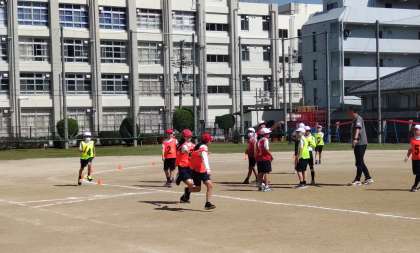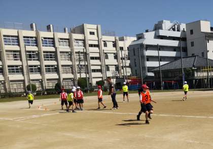 リレーのバトンパスの学習としました。後ろを向かずに「ハイッ」というかけ声で渡せてる子もいました。