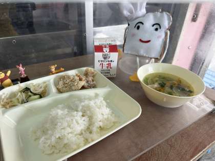 今日の給食は、鶏肉のからあげ、中華スープ、チンゲンサイともやしの甘酢あえです。