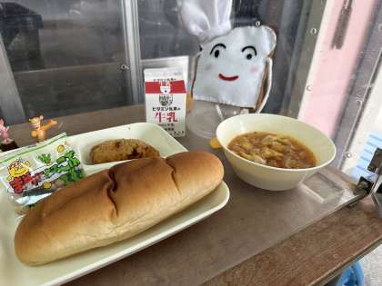 今日の給食は、一口トンカツ、ミネストローネ、豆こんぶです。