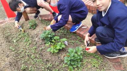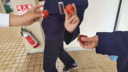 今年の栽培委員会では、いちごを育てています。早速赤く色づいたいちごを収穫しました。