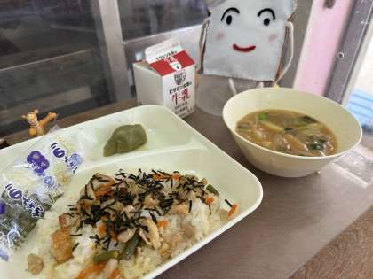 今日の給食は、かやくご飯(きざみのり)、みそ汁、まっ茶ういろうです。