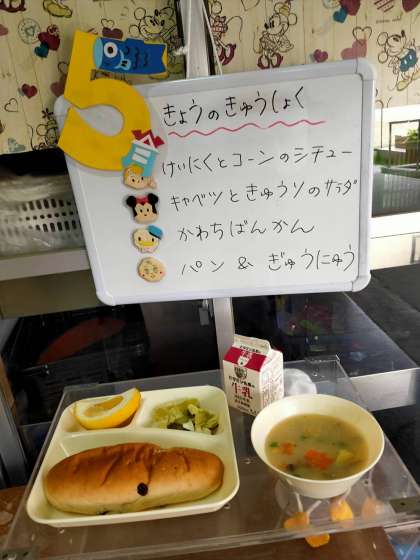 今日の給食は、鶏肉とコーンのシチュー、キャベツときゅうりのサラダ、かわちばんかんです。