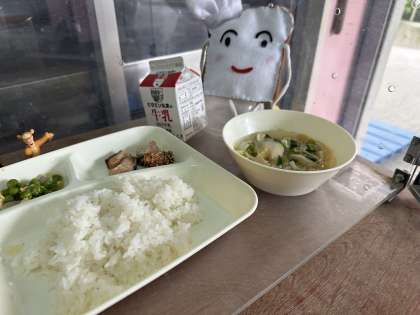 今日の給食はさけのごまみそ焼き、五目汁、えんどう卵とじです。
