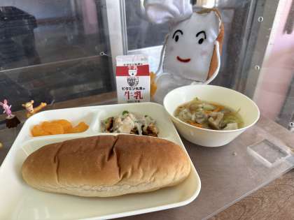 今日の給食は、マカロニグラタン、キャベツのスープ、みかん(かんづめ)です。