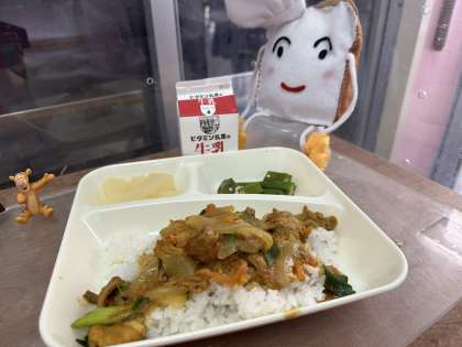 今日の給食は、和風カレー丼、オクラのかつお海風味、和なし(かんづめ)です。